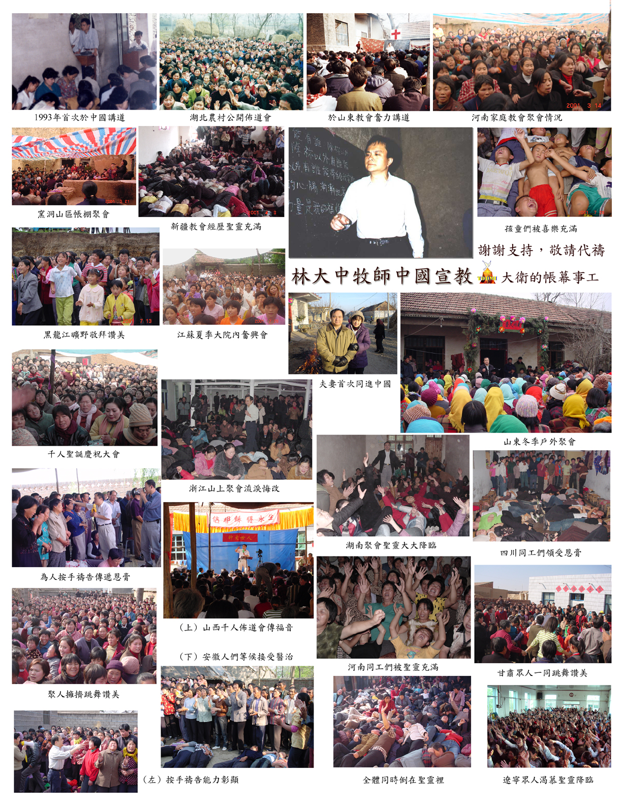 1992年﹕首度進入中國,開始每年進入中國服事。 1993年﹕開始與包德寧牧師同工,積極地參與中國宣教事工﹐服事中國各地家庭教會。 1995年﹕開始參與好牧人國際教學課程事工,為各國講員擔任國語翻譯,並製成錄影帶與錄音帶。 1996年﹕成立大衛的帳幕事工,全職服事中國、台灣、北美各地教會。憑信心生活,依靠神的供應,在各地帶領奮興聚會及佈道會,並與台灣更生團契同工,在台灣各地監獄佈道,醫病趕鬼,神用大能並神蹟奇事印証所傳的道。 目前仍積極參與中國教會的復興運動。 我出生於一個不信耶穌的家庭,十歲與二哥跟著信主的舅舅前往長老會信友堂聚會,參加教會少年團契與詩班。主日常喜愛聽陳維屏老牧師講道更甚於兒童主日學,並能明白屬靈的真理。我於十二歲的聖誕夜受洗,當日受洗前不停地哭泣在主前,深深感到自己是個罪人,必須呼求主耶穌的名方能得救。當時寇順舉牧師為我按手施洗時,全身從頭到腳感到一股能力而發麻,原來是聖靈在澆灌我,因我不明白,後來就不敢跟人提起此經歷。 受洗後幾年平安喜樂,卻感到置身象牙塔中,不太知道教會外的世界,又見教會多是高官顯貴知識份子,不見賣菜老太婆與放牛班的孩子,雖知神愛世人,但誰把福音傳給他們?於是十四歲時就向神立下心志,將自己奉獻給神來傳福音,開始接觸那些好玩的孩子。由於自己無知,靈命尚未成熟,結果沒帶領他們來到教會,卻反而跟他們同流合污,染上吸煙、喝酒、打牌、跳舞、交女友、打架、鬼混等各樣的惡習,漸漸地遠離神與教會。 十六歲雖考上全國最佳的建國中學,卻成了少數的不良少年、流氓學生。往往每天到校,書包一放,就到西門町尋樂滋事。當時我是多處舞會的常客,無照駕駛機車多次闖禍,考試又專靠作弊。教官屢勸不改,老師見空位興嘆,父母正忙於做生意,卻不明白為何一個好好的孩子變成如此,脾氣惡劣,把家當成旅館。兩次幫派械鬥前,由於神的憐憫,安排完全不認識的人,將我拉開現場,而免於犯罪受牢獄之刑罰。 後來出一次事後,當學校想要開除我,才醒悟過來自己正在無底深淵的邊緣,卻無法自救。心中充滿了悖逆,聽不進任何人的話,處於極大的黑暗當中。雖想脫離那班朋友,他們卻不放過我;走在路上,還怕後面有人要追殺我。當晚孤單無助時,想起少年所信的主耶穌,禱告求神改變我的心,守約施慈愛的神聽了我的呼求,心中居然霎時一個轉變,不想再浪費歲月,而想改過自新,不再標新立異、身穿奇裝異服想引人注目。次日連教官都驚訝是什麼力量使我改變!往後雖想改好,仍靠己力常常跌倒,所不願做的惡反倒去做。 雖想彌補過去糊塗時所浪費的光陰,高中畢業仍未考上大學,失望之餘,十八歲開始在家幫忙做生意,每天十餘小時,晚上與生意友人在酒廊喝酒,解悶至半夜。生活毫無目標,而酒醒後更加痛苦。於是向父親要求三個月準備重考,考前半夜突然驚醒,想起還有許多本教材尚未讀,當夜找出後急忙翻過,結果靠此救回分數,正好能考上大學,否則得去當兵,又是神的憐憫。 廿歲考上淡江大學電算系,卻是全國聞名高淘汰率的科系,於是發憤唸書想彌補過去浪費的年日。結果每學期均名列前茅,最後以全系第一名畢業。此時卻以為只要靠自己努力,天下沒有做不到的事情。不知不覺自己變得何等驕傲,目中無人,事實上仍有些惡習總是改不了。 於是神管教的手再次臨到,雖辛苦考上預官卻被分發到海軍陸戰隊,此時才覺悟人生不是在我的掌握之中,乃是在神的手裡,埋怨也無用。後來在軍中仍是仗恃自己聰明,依然喝酒尋樂,身為參謀,居然有次擅自敢更改命令,又喝酒出事要依法查辦。此時已收到美國大學研究所獎學金的入學許可,這下出國的美夢泡湯了!面對人生的危機,再度被震醒,又想起少年所信的主,哭泣悔改在神面前求祂幫助,並拿出許久未翻的聖經,一夜讀完羅馬書,結果此事得蒙寬待而未辦理,才能出國。出國前還喝酒打架滋事,結果車禍受傷,差點命都沒了!又是神再次的憐憫。 來美國後,離開所熟悉的環境,並回顧自己的一生,幾次的教訓使我知道浪子該回家了。到賓州州大留學時,回到教會參加查經班,週五的查經使我在學業與生活的壓力下得到安慰。但是一心仍以追求博士學位、成為大學教授為首要目標,而神與教會卻視為不重要。結果碩士畢業時,因最後一科拿B而未得全A,而感到失望,原本想去找教授爭取成績,裡面卻有聲音說:「算了吧,又怎麼樣呢?不過又是一場虛空!」畢業以後,依照神的帶領來到加州,順利找到高薪電腦工程師的工作,買了車子、房子,父母亦移民來到美國,在教會亦熱心服事。表面上看似一切順利,照理應當滿足,但心裡依然空虛。自己身為基督徒,言行卻與世人並無分別,一樣追求世界,軟弱又無見証,單憑血氣服事。 雖從小知道心裡對中國的負擔,敬佩孫中山為中國做大事,記得青少年酒醉時,還曾說:「我們是中國迷失的一代。」亦知道神帶我來美國是為著預備服事將來的中國。卅歲正當我對教會、更對自己失望,感到人生無意義而想自殺時,神卻沒有忘記祂的孩子,因神從我出母胎就造就我,慈繩愛索從未離開我,記念我年少向祂許的願。當我絕望時,正想參加海外興中會一展抱負,神卻差遣祂的僕人愛德華米勒牧師,來到宣道會主講「復興的火」。經再三猶豫考慮後,決定給神最後一次機會,看看是否能使我奄奄一息的靈命