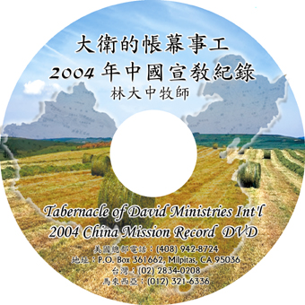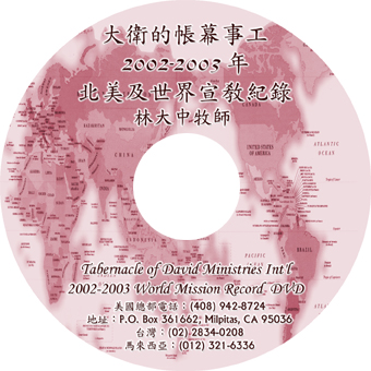 大衛的帳幕事工製作DVD、VCD ($5 each) 簡介:將近年來於海外世界各地全場講道錄影從中擇優製作成DVD、VCD兩種格式。弟兄姊妹雖無法親臨現場參加聚會,藉由此媒介即仍可同樣聆聽到神的話語。(網上收錄)